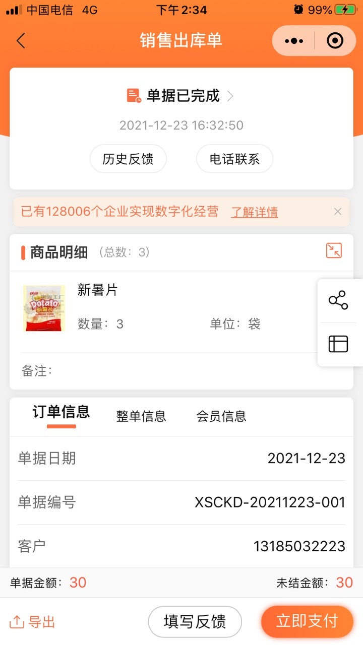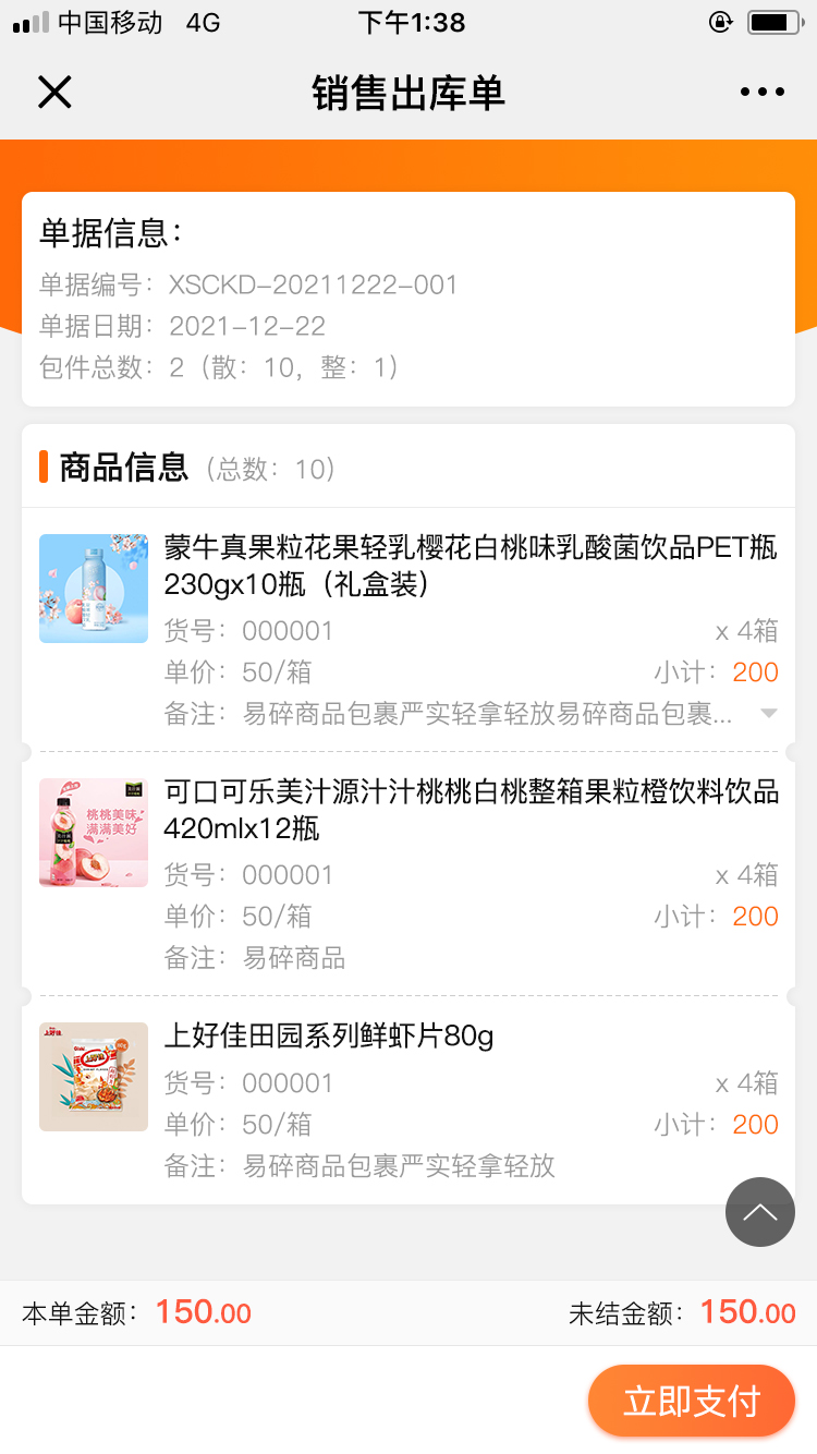 来肯企汇系统中的出库单和对账单,都能一键分享给客户,客户打开分享的单据后,能够看到此次交易的商品明细和应付金额,客户确认无误后可直接点击【立即支付】进行付款。