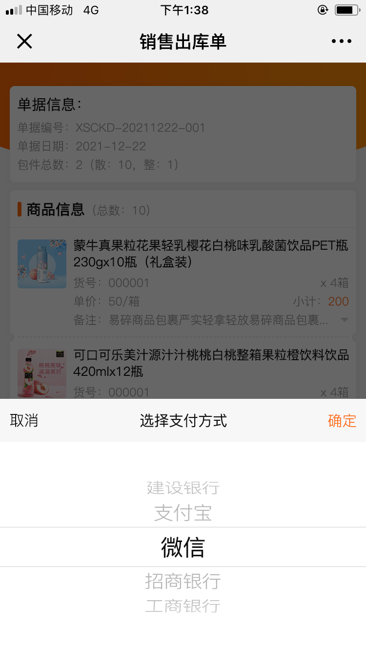 司机配送前需在库房打印一张出库单,上面详细显示了客户下单的商品明细,也附带有收款二维码,完成配送后可将此出库单交给客户,客户核对商品、价格等信息无误后,直接扫描上面的二维码付款,快速完成此次交易。